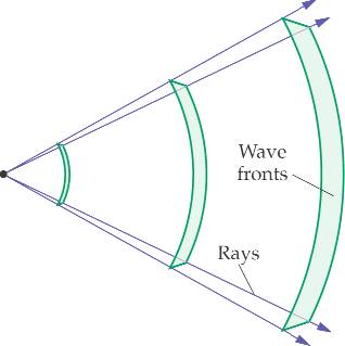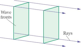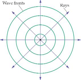 If a stone is dropped into a pond, circular waves emanate from the point where it landed. Rays, perpendicular to the wave fronts, give the direction in which the waves propagate. |