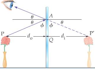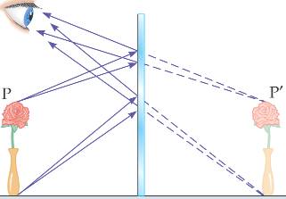 Light reflected from the flower and vase hits the mirror. Obeying the law of reflection, it enters the eye. The eye interprets the ray as having had a straight-line path, and sees the image behind the mirror. |