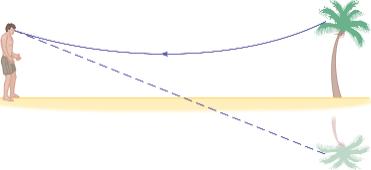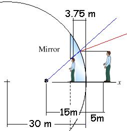 A guy named Joe, who is 1.6 meters tall, enters a room in which someone has placed a large convex mirror with radius of curvature equal to 30 meters. The mirror has been cut in half, so that the axis of the mirror is at ground level. As Joe enters the room, he is 5 meters in front of the mirror, but he is looking the other way, so he fails to see it. When he turns around, he is startled by his own image in the mirror. |
