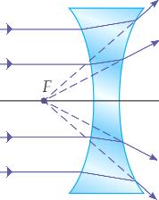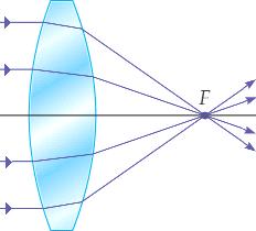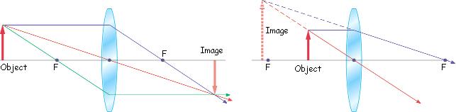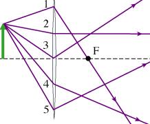 Example (a) The focal point of the lens is labeled F. Five rays are drawn from the tip of the object to the lens, but only one of them is traced through the lens correctly. Choose the ray that is traced correctly. |