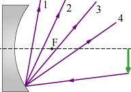 (b) This second figure shows an object to the right of a concave mirror. The focal point of the mirror is labeled F. Four rays are shown reflecting off the mirror, but only one of them is drawn correctly. Choose the ray that is traced correctly. |