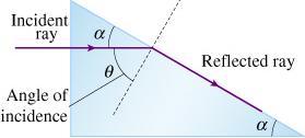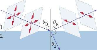 Reflected light is completely polarized when the reflected and refracted beams are at right angles to one another. The direction of polarization is parallel to the reflecting surface. |