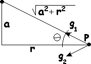 cos θ = adj / hyp cos θ = r / (a2 + r2)1/2 mg1 = GMm/r2 g1 = GM/(a2 + r2) |