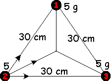 consists of three particles, each of mass 5.00 g, located at corners of an