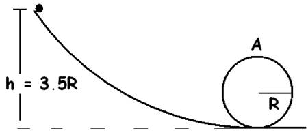 A 5 gram bead slides w/o friction around a loop-the-loop. The bead is released from a height h=3.5R. a) What is the speed at A b) What is the normal force at this point? |