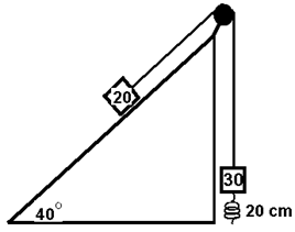 A 20 kg block is connected to a 30 kg block by a string that passes over a frictionless pulley. The 30 kg block is connected to a spring that has negligible mass and a force constant of 250 N/m. The spring is unstretched when the system is shown as below. The 20 kg block is pulled 20 cm down the incline (so the 30 kg block is now 40 cm above the floor) and is released from rest. Find the speed of each block when the 30 kg block is 20 cm above the floor (unstretched)