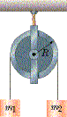 Example If a frictionless pulley has an inertia of 1 kgm2 (which can be modeled as a solid disk), where m1 = 8 kg, m2 = 12 kg, and R = 40 cm; what is the acceleration of the system? |