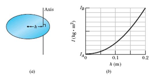 Figure (a) shows a disk that can rotate about an axis at a radial distance h from the center of the disk. Figure (b) gives the rotational inertia I of the disk about the axis as a function of that distance h, from the center out to the edge of the disk. The scale on the I axis is set by IA = 0.150 kg·m2 and IB = 0.450 kg·m2. What is the mass of the disk?