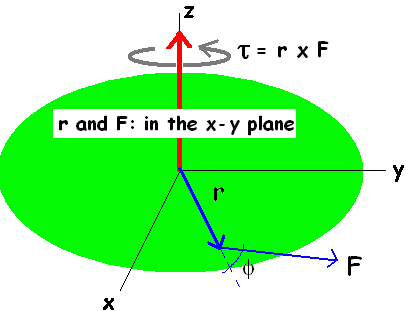 Lets say that a 3 meter rod is oriented in the x-y plane as seen to the right (pointing to the forward and right position so that, r = 2i + 3j + 0k). A 5 Newton force is applied in the same plane, but with only a small component in the x-plane, F = 1i + 4j + 0k. What is the resultant torque where t = r x F? |