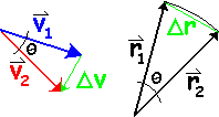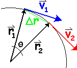 With this as a base let’s follow a few steps: v Draw in two radii vectors, r1 & r2 at an angular displacement of θ v Draw in change of position of the radii vectors, Δr v At the position of radii vectors r1 & r2, let draw in velocity vectors v1 & v2 v Next, displace so that velocity vector tails so that they are adjacent to each other. o Since vector v1 is perpendicular to r1 & v2 is perpendicular to r2 the angle, θ, between r1 & r2 must be the same as the angle between v1 & v2