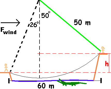 Workgravity = m g h = mg (50 cos26° – 50 cos50°) = mg(44.9 - 32.1) = 5000 Nm Workwind = Fwind ∫dr = 6000 Nm |