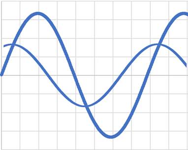 Peak to peak voltage: The voltage from the trough to the crest; (count the vertical blocks and multiply by volts per division) |