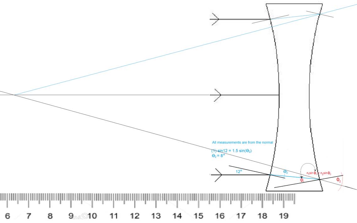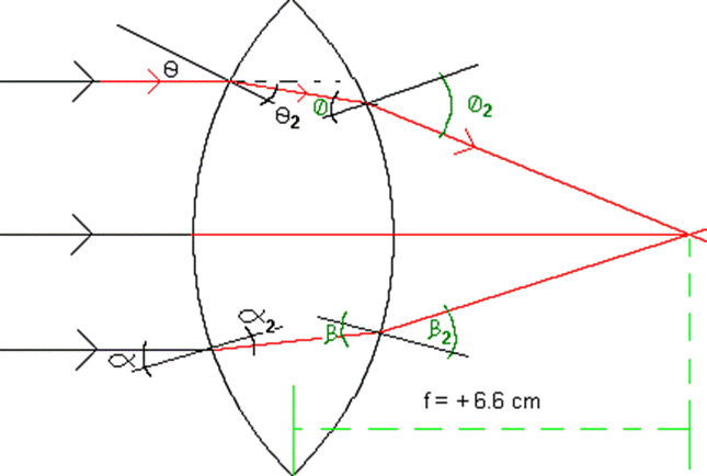 To the right is an example of a ray tracing implementing Snell’s law to calculate the refraction of the rays from air to glass, then glass to air of a double convex lens |